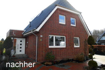 Im Inneren des Hauses erfolgt eine Komplettsanierung des Dachgeschosses, die eine Neugestaltung der Räume und neue Bäder umfasste. Durch eine geschickte Umorganisation der Innenräume wurde eine zeitgemäße und funktionale Raumnutzung geschaffen, die den Bedürfnissen der Bewohner gerecht wird. Als Ergänzung zum Umbau wurde ein neuer Carport errichtet, der nicht nur praktischen Schutz für Fahrzeuge bietet, sondern auch das Gesamtbild des Anwesens abrundet.